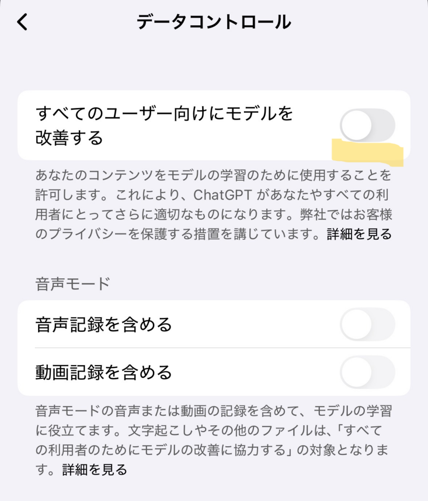「すべてのユーザー向けにモデルを改善する」をオフにしましょう。