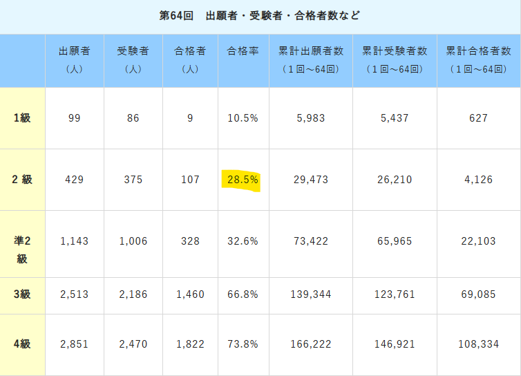 最新の第64回(2025年11月)の合格率を見ると、合格率は28.5%です。