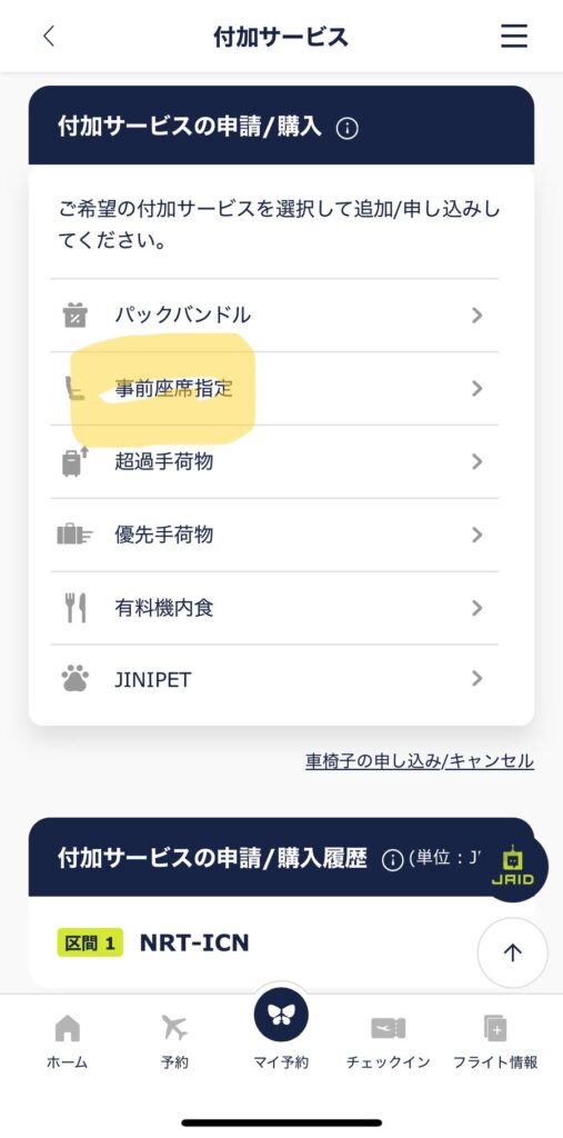 私は今回事前座席指定のみ利用しましたが、他超過手荷物などのサービスもこちらからできるようです。