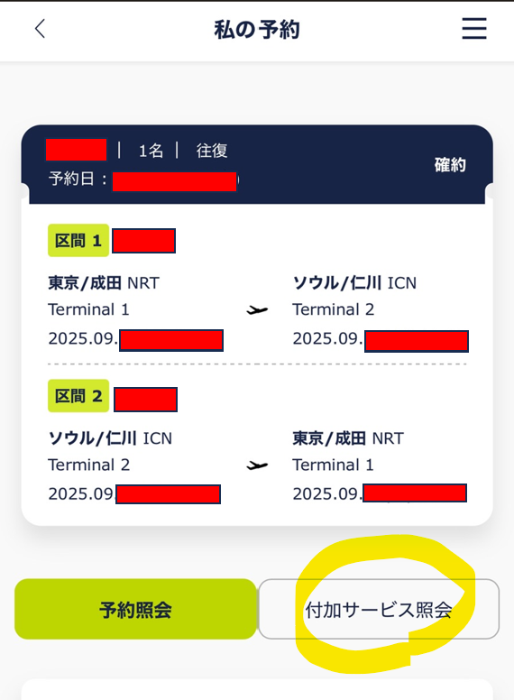 ・同行者を追加後、再び「私の予約」に戻り、「付加サービス照会」を選択します。